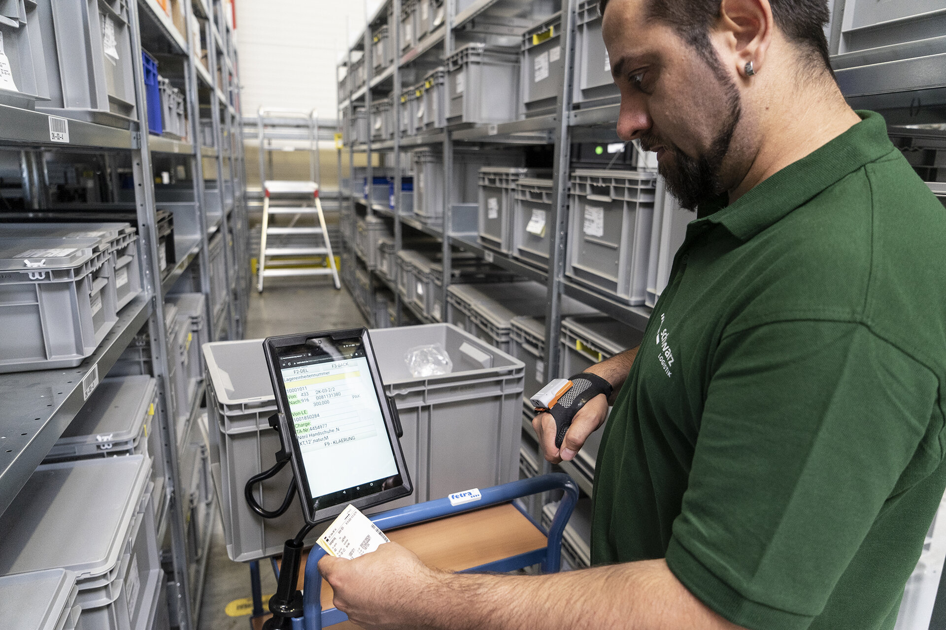 Besonders beim Kommissionieren von Kleinteilen ist es lästig: Immer wieder muss man den Handscanner zur Seite legen, um beide Hände nutzen zu können. Dadurch kann es leider passieren, dass auch einmal ein falscher Artikel gegriffen wird. Dennis Weimert hat sich auf einer Logistikfachmesse nach einer besseren Lösung umgesehen und ist fündig geworden: In dem neuen Scanninghandschuh, der aktuell bei Schwarz getestet wird, ist ein leichter Scanner integriert. Er wird durch ein Tippen mit dem Daumen ausgelöst. Als Display wird ein Tablet am Kommissionierwagen genutzt. Das bringt einen weiteren Vorteil: Mehr Platz auf dem Bildschirm, um dem Lagerarbeiter wichtige Infos zum Umgang mit den gerade kommissionierten Artikeln einzublenden. Scanninghandschuhe und Tablets sollen unter anderem im neuen Kleinteilelager zum Einsatz kommen.