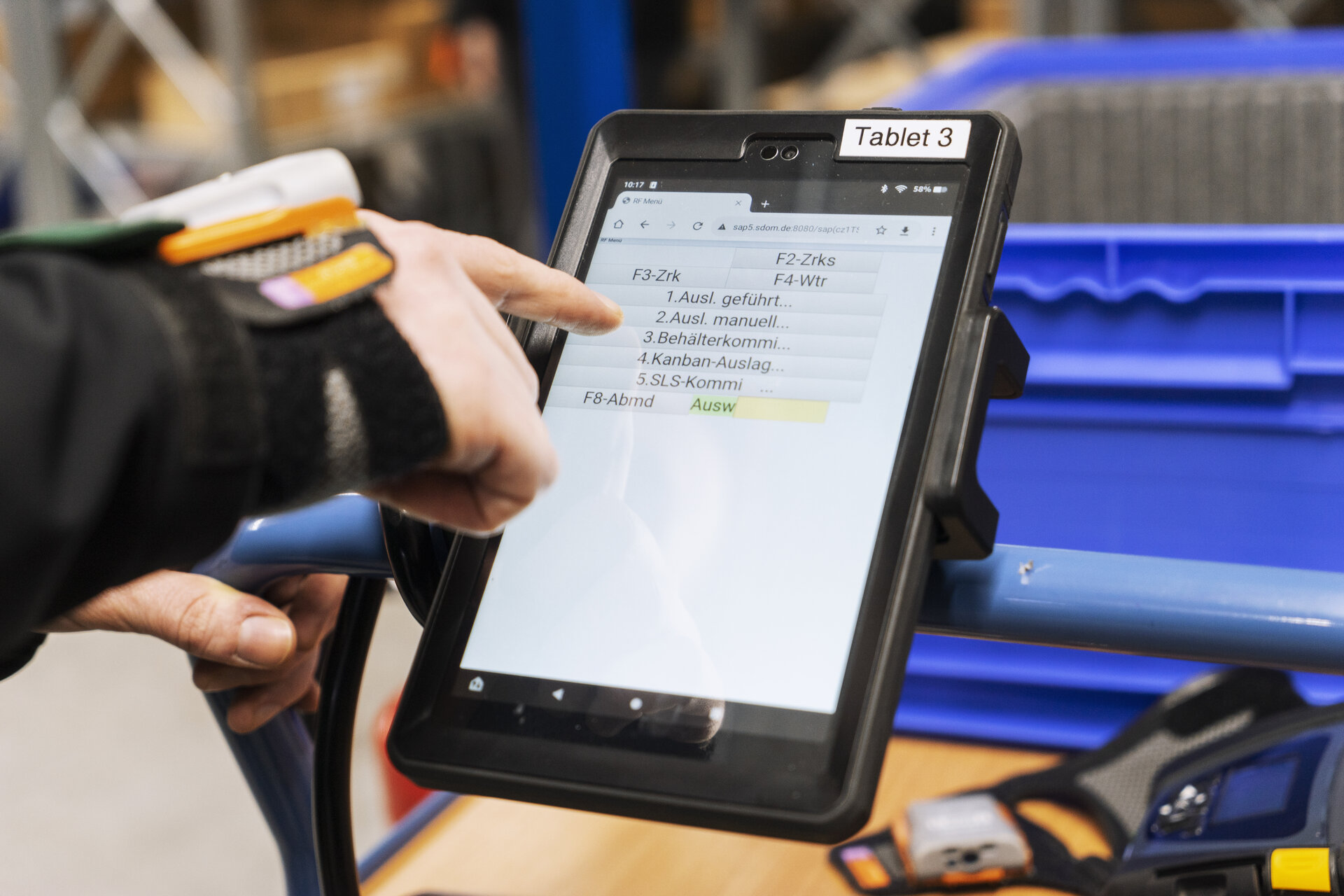 Projektmanager Tim Majer demonstriert das neue Gerätetrio für effizientere Lagerarbeit: Scanninghandschuh, Tabletcomputer und mobiler Drucker.