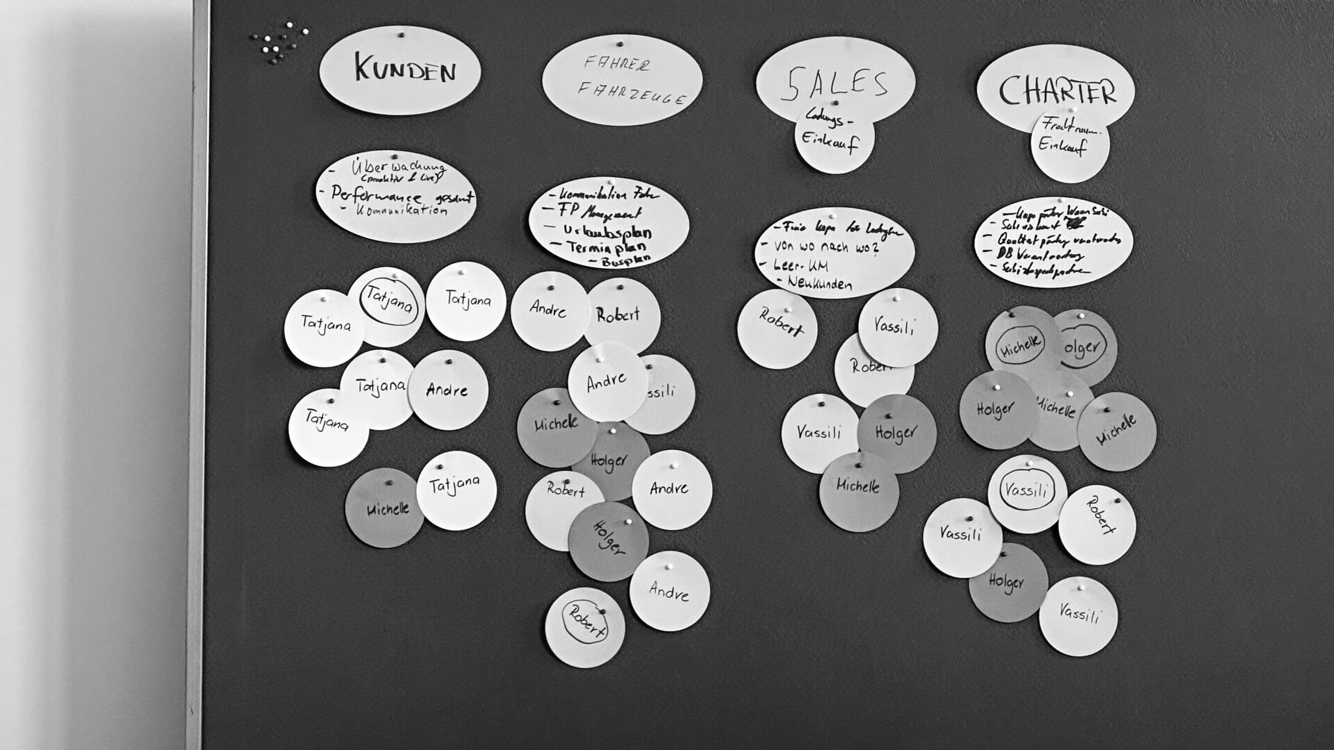Gemeinsam verglichen die Teilnehmenden verschiedene Modelle der Arbeitsaufteilung: keine Aufteilung – jeder disponiert alle Arten von Transporten – oder eine Aufteilung nach Kunden, Fahrern, Fahrzeugen, Relationen oder Fachthemen. Derzeit verfährt die Dispo in Herbrechtingen nach dem Modell „Alle machen alles“. Im gegenseitigen Austausch stellte sich heraus, dass dieses Modell grundsätzlich bestehen bleiben sollte. Dafür sprechen eine große Flexibilität sowie die gegenseitige Kontrolle und Unterstützung. Betrachtet wurden aber auch die Nachteile einer fehlenden Spezialisierung wie zum Beispiel Reibungsverluste, eine große Menge von Basisanforderungen für alle und gegebenenfalls eine geringere Kompetenztiefe bei speziellen Themen.